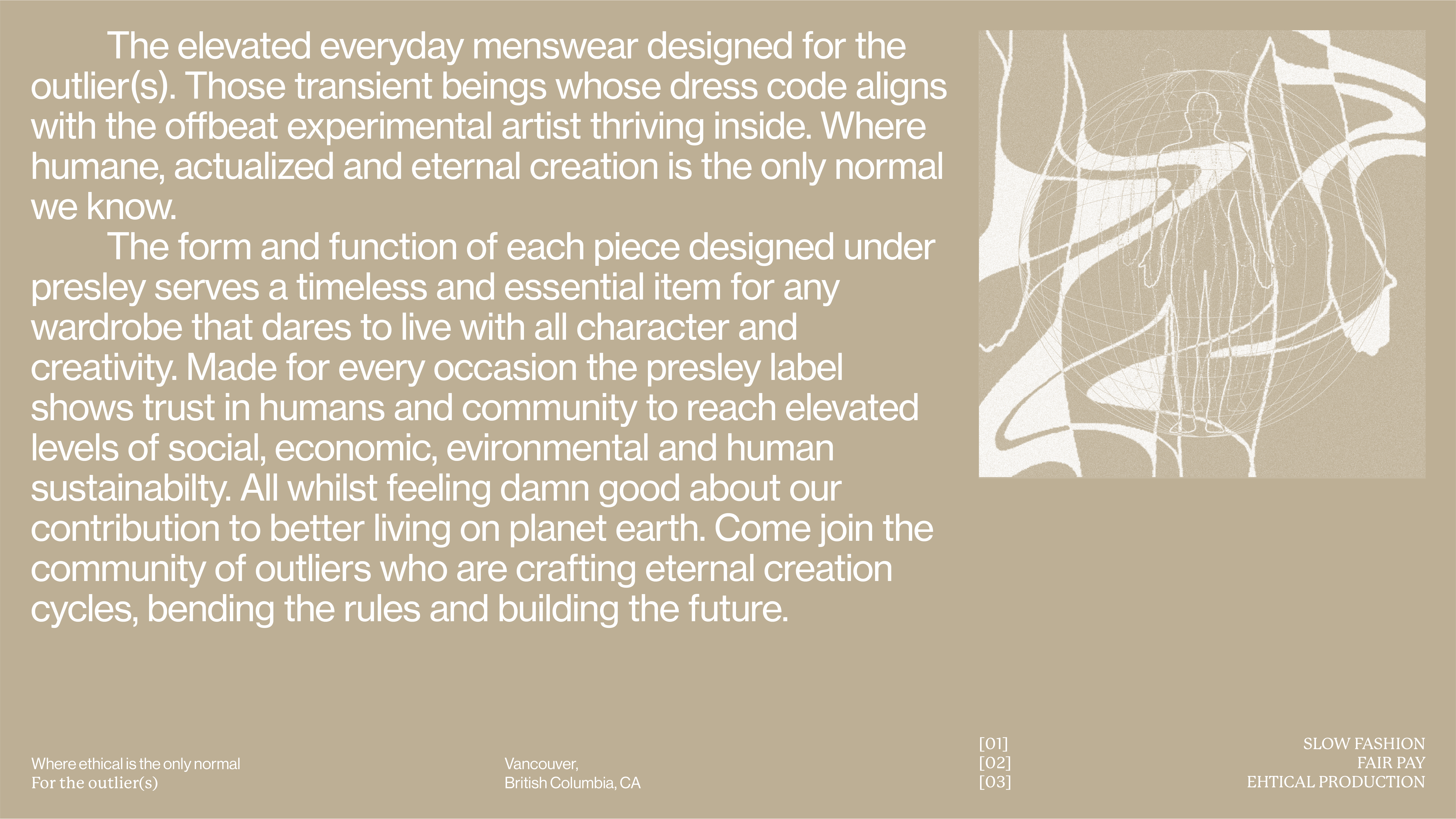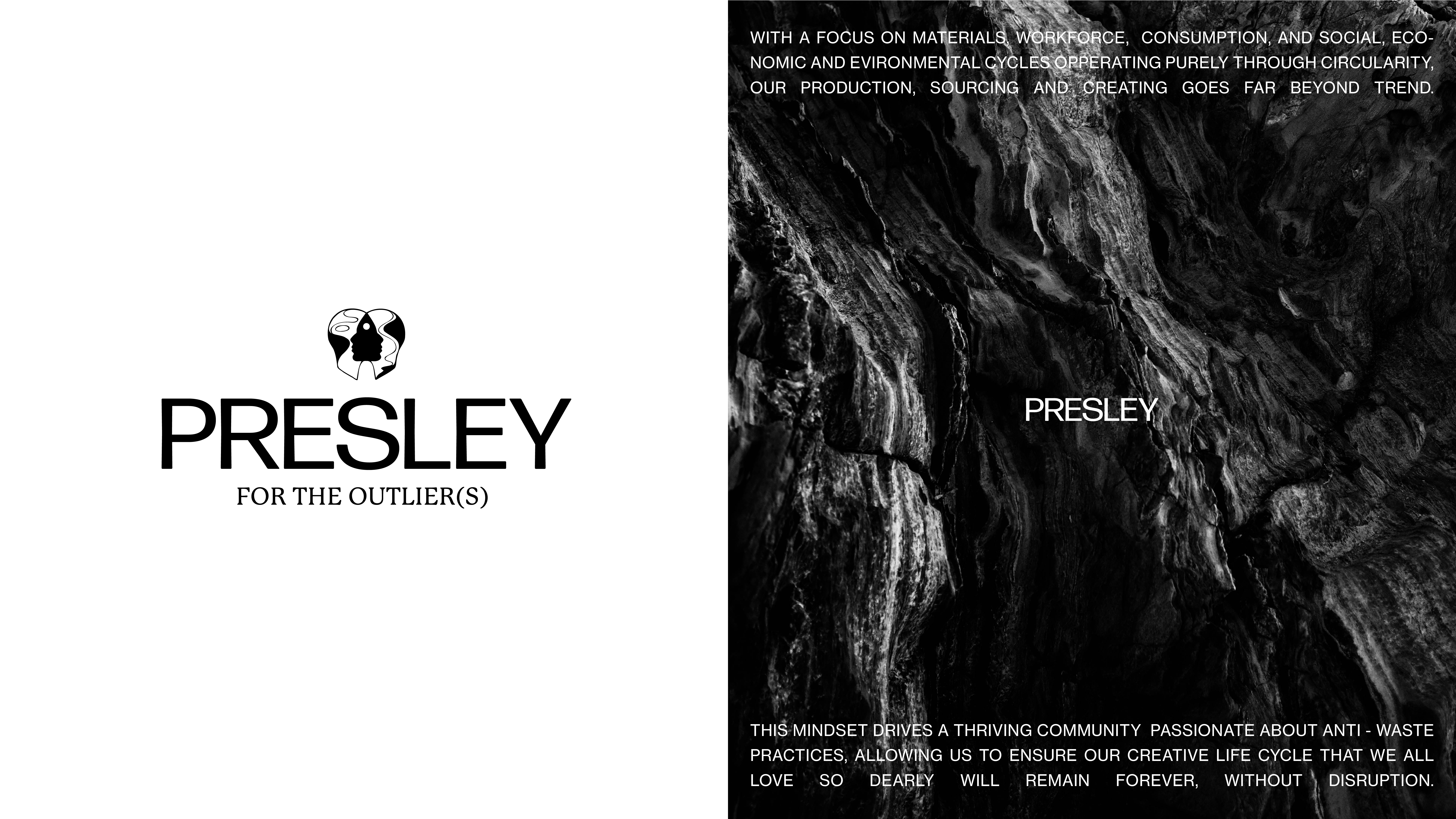 Made for every occasion the Presley label shows trust in humans and community to reach elevated levels of social, economic, environmental and human sustainability. This essential, refined and bold approach to carving a new path in the fashion industry reflects in the visual language. Portraying a timeless brand that goes beyond trend whilst showing edge and creative freedom.